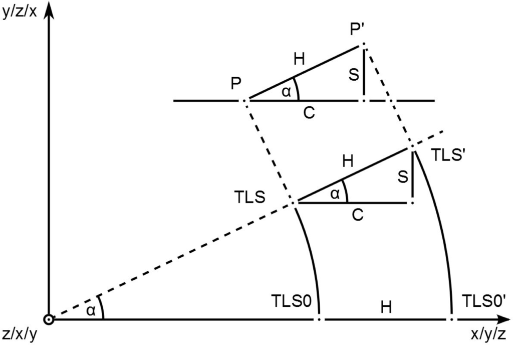 The external position and orientation determination includes all of the procedures determined by the lever arm, an additional measuring system and the position angle. Various instruments can be used for this purpose, such as total stations, photogrammetry, fringe projection systems or laser trackers. For the platform at the HCU, a fringe projection system is used, because its size is only 1 m by 0.4 m. Whether these instruments are suitable for the position and orientation determination in terms of accuracy will be discussed through two examples. In the first example, it is assumed that the lever arm of the laser scanner Δx, Δy or Δz was determined at an accuracy of 1 mm and that the vehicle moves on a road that has a slope of 4° degrees in the traveling direction. The Figure 3 shows that the correct lever arm, TLS0, leads to a fault point, TLS0′, due to the error, H. With a slope of α, the points shift toward TLS and TLS′.
