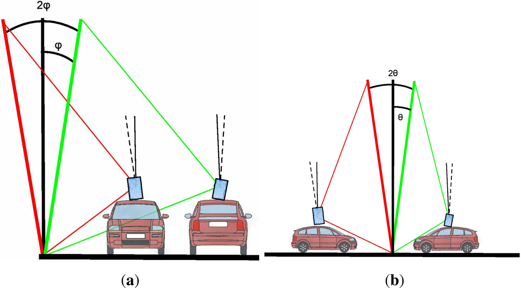 Configuration for the calibration of pitch and roll angles; for both angles, when the vehicle passes along an object, the difference of the two passes can be used to estimate the roll and pitch angles. (a) Roll; (b) pitch.