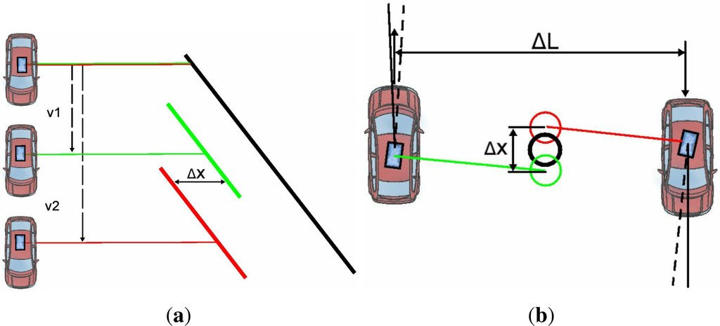 Configuration for the calibration of time offset and yaw angle offset. The vehicle is driven by an object at two different speeds to observe the timing error. The timing error is then derived from the geometric errors. To determine the azimuth error, a round object should be passed by from two sides. The offset between the two objects is then used to estimate the azimuth error. (a) Time; (b) yaw.