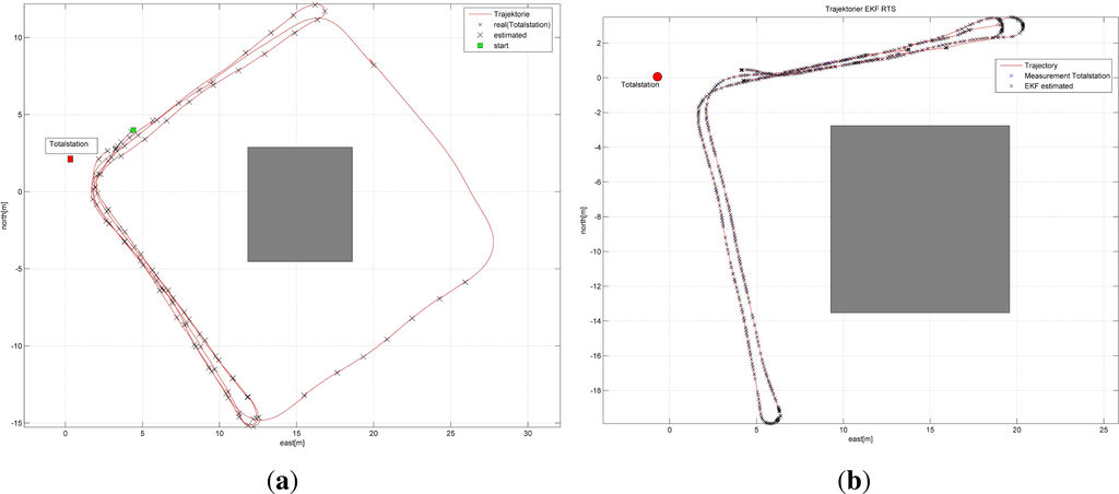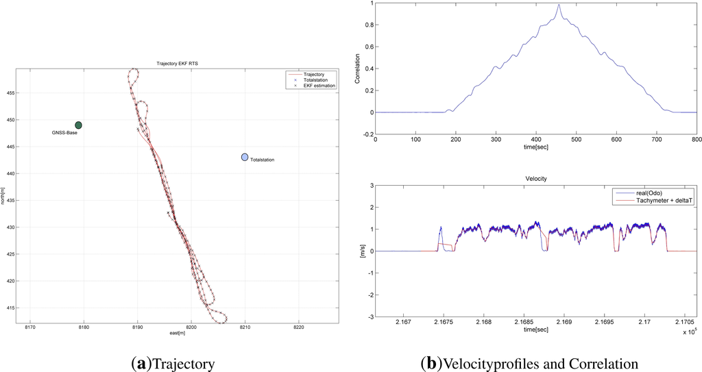 where kIMU and kTPS are the same points in time, m is a scale that is generated by the different time drifts of the system and b is the offset between the two time systems. First, it is assumed that both systems have only one offset and a stable scale m = 1. To determine the offset, b, two velocity profiles are needed. The first can be the velocity profile of the odometer. The second can be calculated from the coordinates based on the measurements by the total station. The time offset of the two time systems can be determined using the cross-correlation. However, residual errors will always remain. At the same time, it is not known which time stamp used is associated with the measurements taken by using the total station. In practice, the angle reading takes place immediately, while the distance measurement requires a few milliseconds. This circumstance leads to an incorrect position in kinematic application in terms of time using the total station. Distance and angle measurements cannot be tagged using the same instant of time. The manufacturers have overcome this difficulty. Leica calls this method “Syncrotrack”. However, it remains undetermined in this research which time stamp is ultimately stored for the total station measurements.