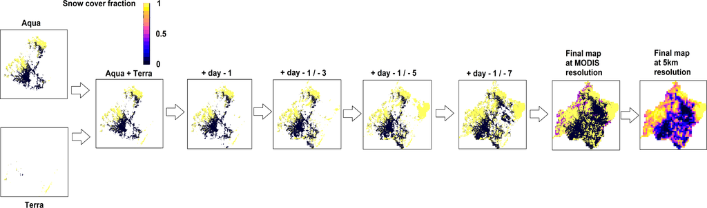 The differents steps for merging MODIS maps. The Snow Cover Area (i.e., SCA) is shown here, from 0 for no snow to 1 for pixels entirely covered by snow. Details are given in the text in Section 3.