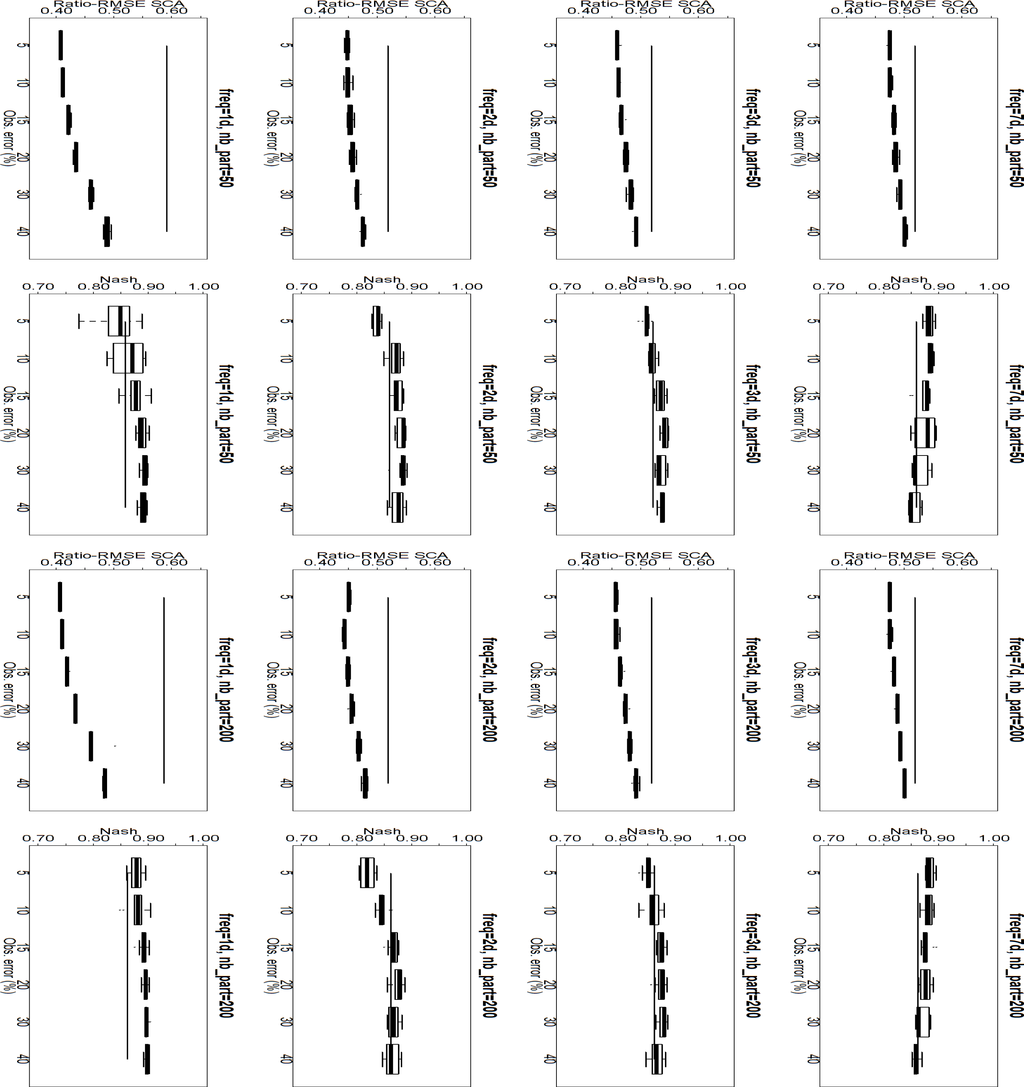Experiments realized with 200 particles lead to the same conclusions (Figure 6). Comparing this figure with Figure 5 shows that the improvement of the LISFLOOD SCA due to the increase of the number of particles is very low. However, in the daily experiments the Nash criterion is significantly improved by the higher number of particles, whereas the other experiments do not exhibit clear modifications.