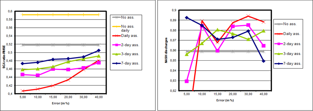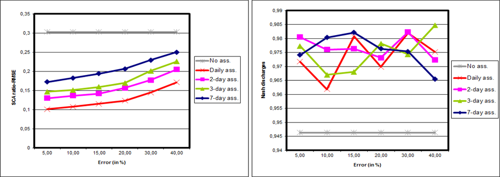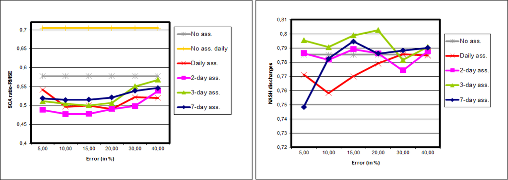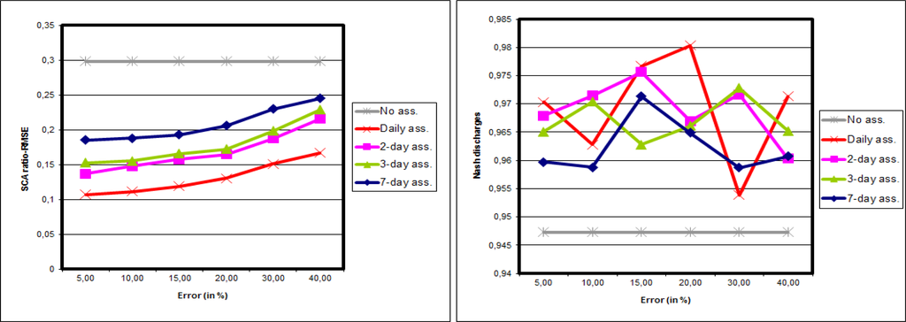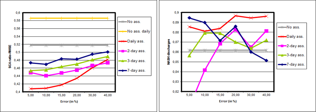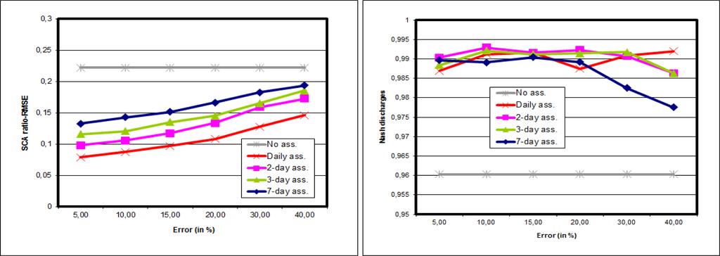 Figure 7 shows the results of synthetic experiments with 50 particles on the whole Morava basin. Figure 7 left leads to similar conclusions as for the synthetic experiments for the Kromericz case. In other words: the SCA is improved for all intensities of observation error, and for all frequencies. The improvement is also higher for high frequency assimilations and for low observation errors. On Figure 7 right the impact of synthetic SCA data on discharges is shown. All experiments show a Nash increase when compared with the reference, whatever the observation error used, and whatever the frequency of assimilation.