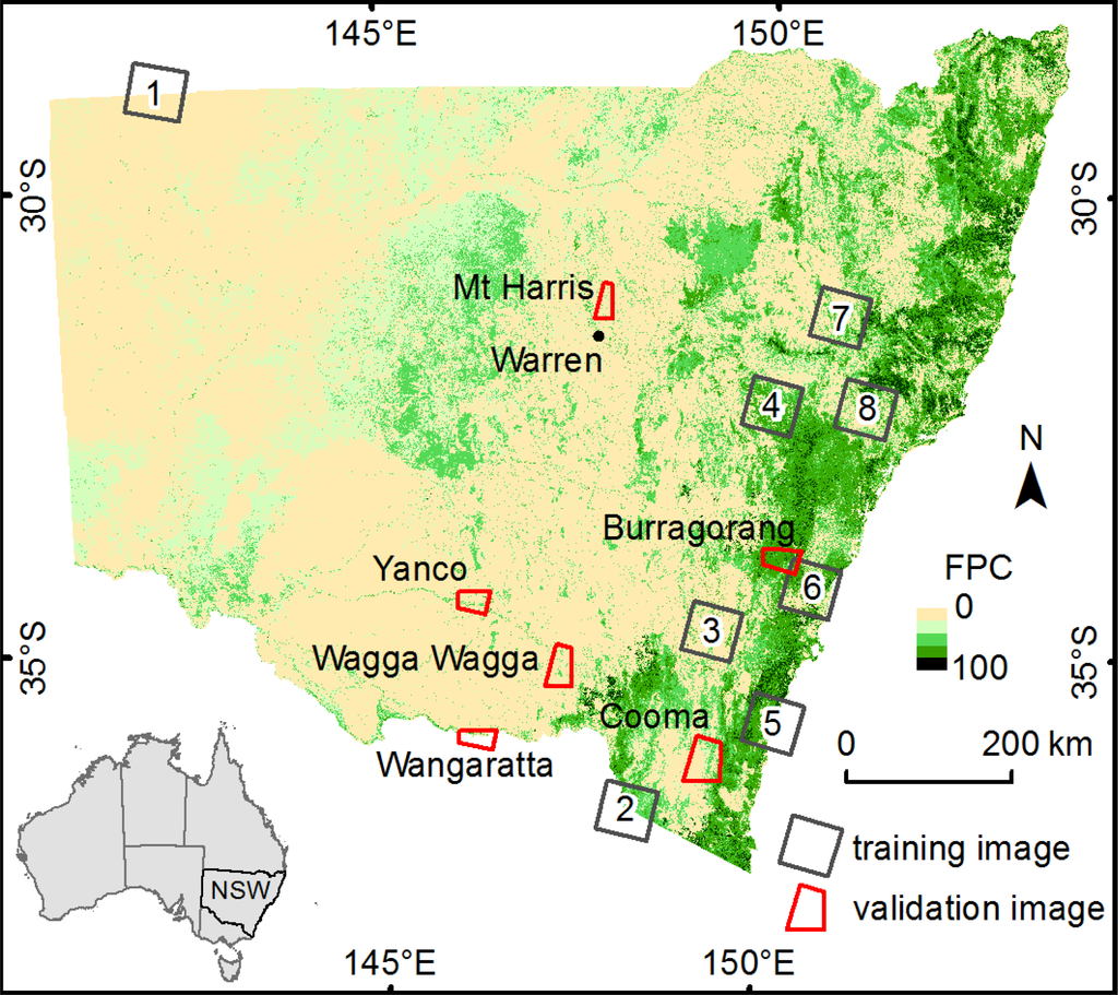 Location of the SPOT5 HRG images across New South Wales (NSW), Australia, used to train and validate the water classification, over Landsat TM/ETM+ derived foliage projective cover (FPC) [17]. The validation images are irregular shapes as they correspond to the areas of overlap between concurrent SPOT5 HRG data and high resolution imagery captured with a Leica Airborne Digital Sensor (ADS40). Greater FPC values correspond to the humid forests of the east coast, while the semi-arid and arid grasslands, shrublands and woodlands in the west have much lower FPC values. The location of the town of Warren is also shown to the south of the Mt Harris validation image.