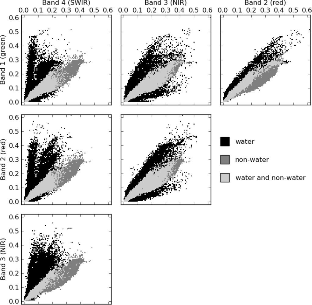 Scatter plots of surface reflectance for the training data (1 million water and 1 million nonwater pixels). In order to show the 2-dimensional spectral overlap between classes, each graph was divided into 100 by 100 bins, and the occurrence of water and non-water was calculated for each bin.
