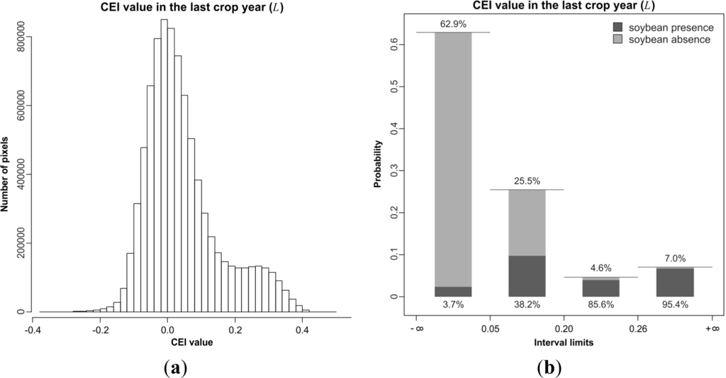 CEI (C and L) observations are also critical variables for this case study as they are closely related to soybean occurrence [46]. Figure 6a shows a histogram of L values in the analyzed area with bimodal appearance. CEI values less than 0.2 are usually associated with targets with low (e.g., forest) or medium seasonality (e.g., Cerrado or pasture) [63,64]. On the other hand, CEI values greater than 0.2 are strongly associated with high seasonality targets such as annual crops like soybean [65,66]. Based on this knowledge, we empirically defined four intervals for L, as presented in Figure 6b.