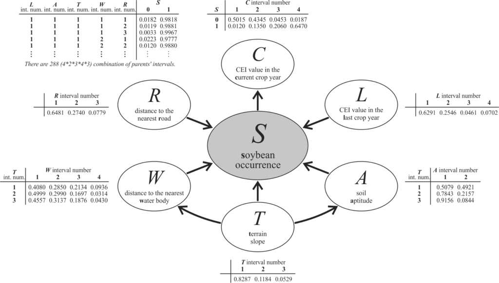 - Context variables—the selected and available variables to compose the model are listed in Table 1. From expert knowledge it is known that each context variable influences soybean occurrence (S).