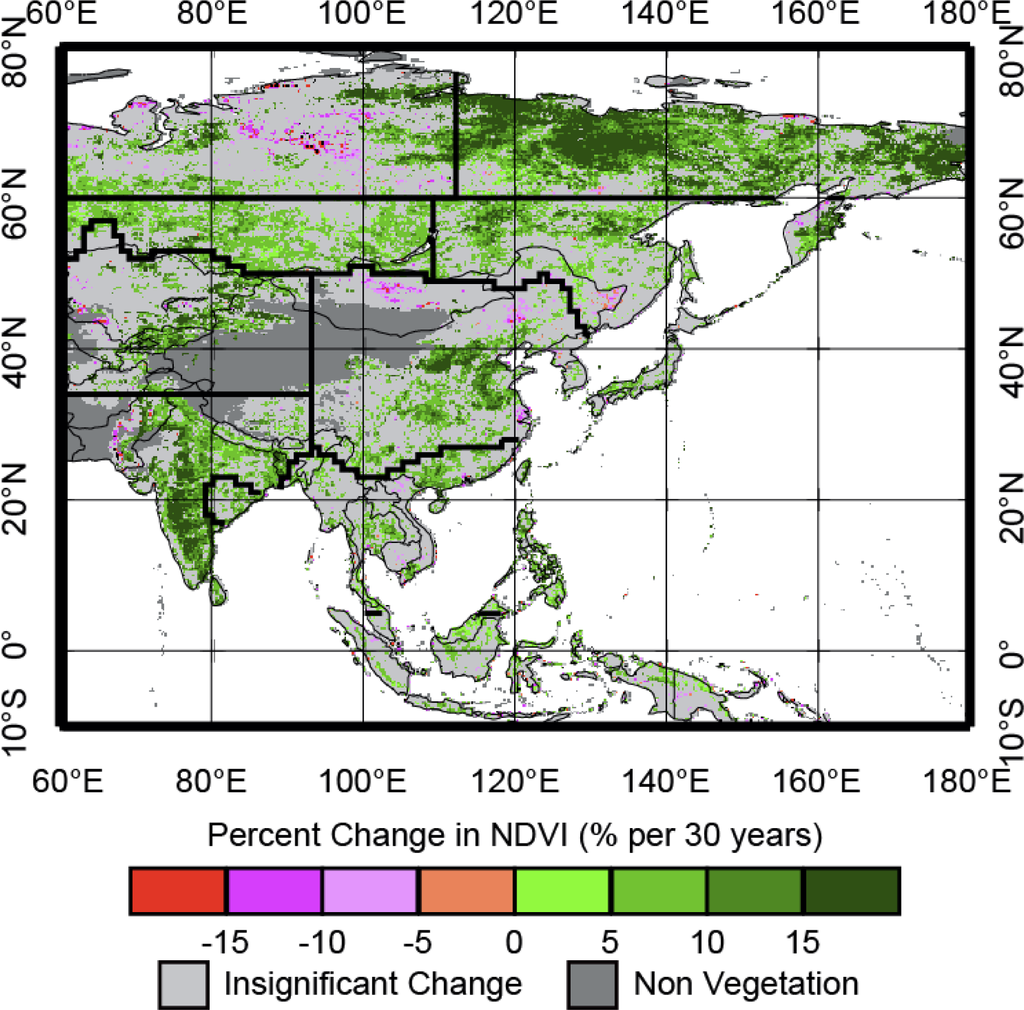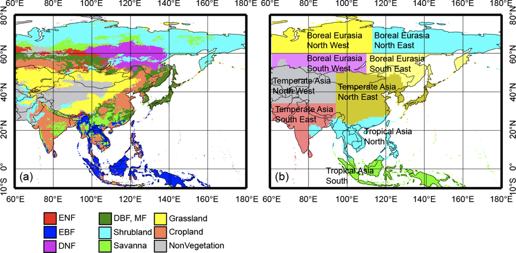 - Park, H.S.; Sohn, B.J. Recent trends in changes of vegetation over East Asia coupled with temperature and rainfall variations. J. Geophys. Res. 2010. [Google Scholar] [CrossRef]