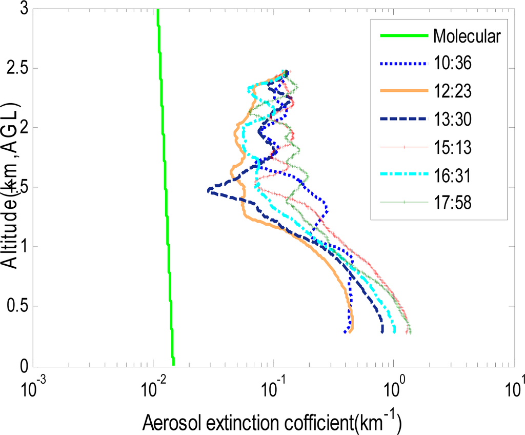 In order to detect the vertical profile of the extinction coefficient and compare the detection performance between daytime and nighttime, the experiments were carried out when it was sunny and cloudless. The measurement was performed from 10:00 am to 20:00 pm when the weather conditions allowed from May to August. The 6 min averaged lidar profiles, comprising 3,600 shots acquired, were used for the extinction coefficient inversion.