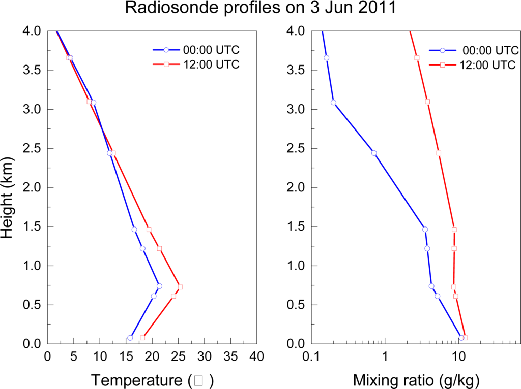 The temperature and water vapor mixing ratio profiles from the radiosonde on 3 June 2011.