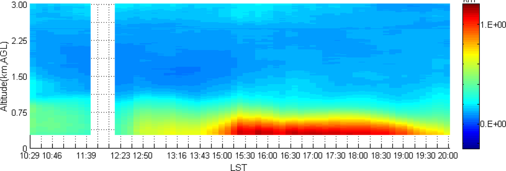 From the Fraunhofer lidar observation, the height of the boundary layer is indicated by a sharp change in the extinction profile. To investigate the development and variation of the aerosol boundary layer, Figure 13 shows the boundary layer evolution in terms of the extinction coefficient observed with the Fraunhofer lidar on 3 June 2013. The maximum detection height is around 2.48 km based on the SNR threshold. For this study, 30 min averages were used to obtain statistically meaningful boundary layer height. A stable boundary aerosol layer below approximately 1 km is observed. According to the local meteorological report there was a sea breeze (south-west wind) and fog emerging in the afternoon. As shown in the Figure 13, a lower layer with a height of below 800 m is due to the sea breeze front emerging at 15:00 LST. The boundary layer fluctuates as the front passes underneath it, showing how sea breeze propagation may produce gravity waves in the overlying stable inversion layer.