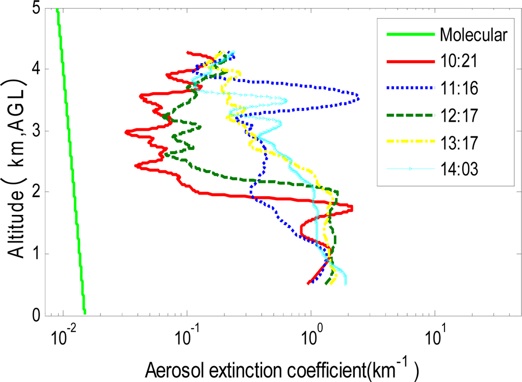 Figure 10 presents the aerosol extinction coefficient profile above the ground level on June 3, 2011, for the lidar ratio of 20, 30 and 35 sr, respectively. As shown in this figure, although it has slight difference when the altitude is lower than 1 km, the tendency of these three profiles is consistent. A ratio of 30 sr is used in this work.