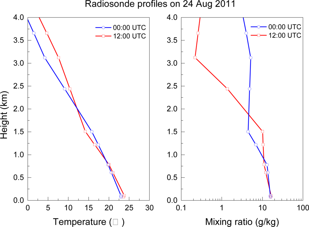 The temperature and water vapor mixing ratio profiles from the radiosonde on 24 August 2011.