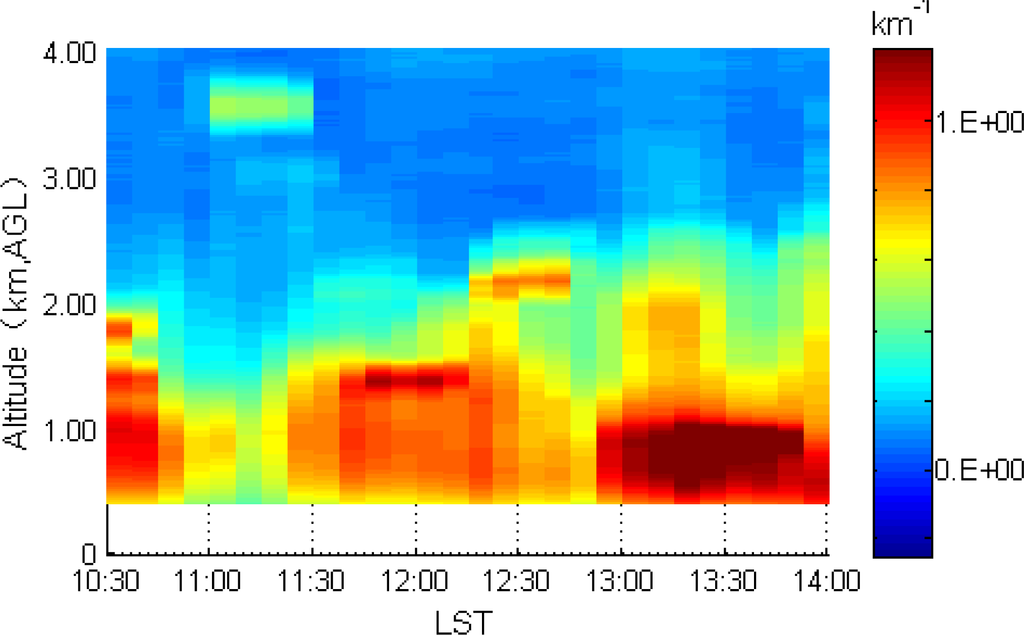 For the first case, one scene of the boundary layer during clear sky condition is shown. Figure 11 presents the vertical extinction coefficient profiles for different times on 3 June 2011. As shown in the figure, the aerosol under 1.5 km increases slowly from 02:30 to 10:30 UTC (from 10:30 to 18:30 LST) and decreases from 08:31 to 11:31 UTC (from 16:31 to 19:31 LST). Meanwhile, the aerosol above 1.5 km has no obvious variation. According to the meteorological data, the relative humidity is 93%∼96% on 3 June. The aerosol extinction coefficient is large because of the moisture absorption effect of the aerosol particles. The extinction coefficient is retrieved above an altitude of around 400 m because of the loss of overlap between the laser beam and the telescope field of view.