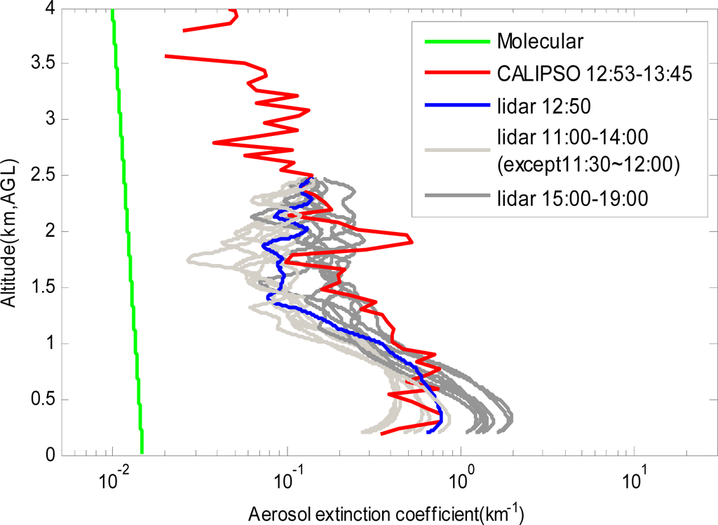 For comparison, Figure 17 presents the profiles of the aerosol extinction coefficient detected by the Fraunhofer lidar and the CALIOP level-2 aerosol profile product under cloud-free conditions (3 June 2011) with a horizontal resolution of 40 km and vertical resolution of 120 m (backscatter, extinction, and depolarization ratio). CALIOP (Cloud-Aerosol LIdar with Orthogonal Polarization) is a two-wavelength polarization-sensitive lidar onboard the NASA/CNES CALIPSO satellite (Cloud-Aerosol Lidar and Infrared Pathfinder Satellite Observation), to provide high-resolution vertical profiles of aerosols and clouds as well as on their optical properties at two wavelengths (532 nm and 1,064 nm) [29]. The Fraunhofer lidar performed measurements before and after the CALIPSO northward-flying over the lidar location within a maximum distance of 46 km at 04:53 UTC (12:53 LST). The averaged CALIOP aerosol extinction profiles between 04:53 and 05:45 UTC (between 12:53 and 13:45 LST) are used for comparison. Spatial and temporal variability of aerosol results in the complex validation analysis of the Fraunhofer lidar measurement by direct comparison with the CALIOP. In this case, although CALIOP overpasses the ground based lidar location with a distance of 46 km, the comparison illustrates that both lidars show consistent trend in the upper part of the ABL (0.7∼1.5 km) considering the spatial inhomogeneity of aerosol distributions.