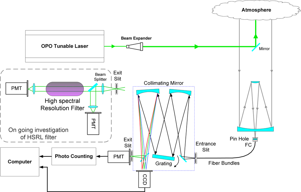 The optical layout of the lidar prototype is shown in Figure 2. The laser used for this application is a tunable OPO (Optical Parametric Oscillator) laser pumped by the third harmonic of a Nd:YAG laser. It is found that the divergence of the laser output is too large to collect backscattered light. A pair of cylinder lens and a beam expander is installed in front of the OPO laser output to produce a circular beam pattern with a lower divergence. A 5 times beam expander follows the cylinder lens to reduce the beam divergence. The backscattering signal is collected by a Schmidt-Cassegrain telescope with 200 mm diameter and is coupled into the fiber bundles that contain 19 fibers, 200 μm diameter each, arranged in a line pattern at the slit end, and round at the source end. The fiber guides the backscattering light into a 500 mm focal length monochromator/spectrograph that has adjustable spectral resolution from 0.02 nm to 5 nm. The photons are detected with a photomultiplier in the exit slit of the monochomater. The photoelectric current is digitized by photon counting technique with a preamplifier. The dashed diagram shows an optional receiver assembly as high spectral resolution receiver consisting of two channels. One of two channels is a molecular vapor filter and the other is the reference channel. The system specification is listed in Table 1.
