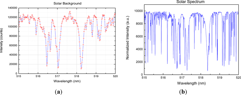 (a) The solar spectra background measured by lidar; (b) the solar spectrum provided by Kurucz 2010 [13].