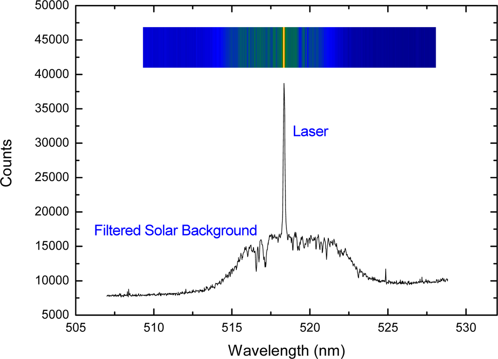 In order to precisely match the laser wavelength and the Fraunhofer lines, the spectral channel using a CCD camera was continuously monitoring the skylight background and the laser backscatters when the laser transmitter was tuning to the minimum of the solar dark line. Figure 5 shows the superposition of the solar spectrum and the laser signal which fills the absorption dip of Mg Fraunhofer line at 518.2386 nm. The energy of the laser was attenuated for better illustration.