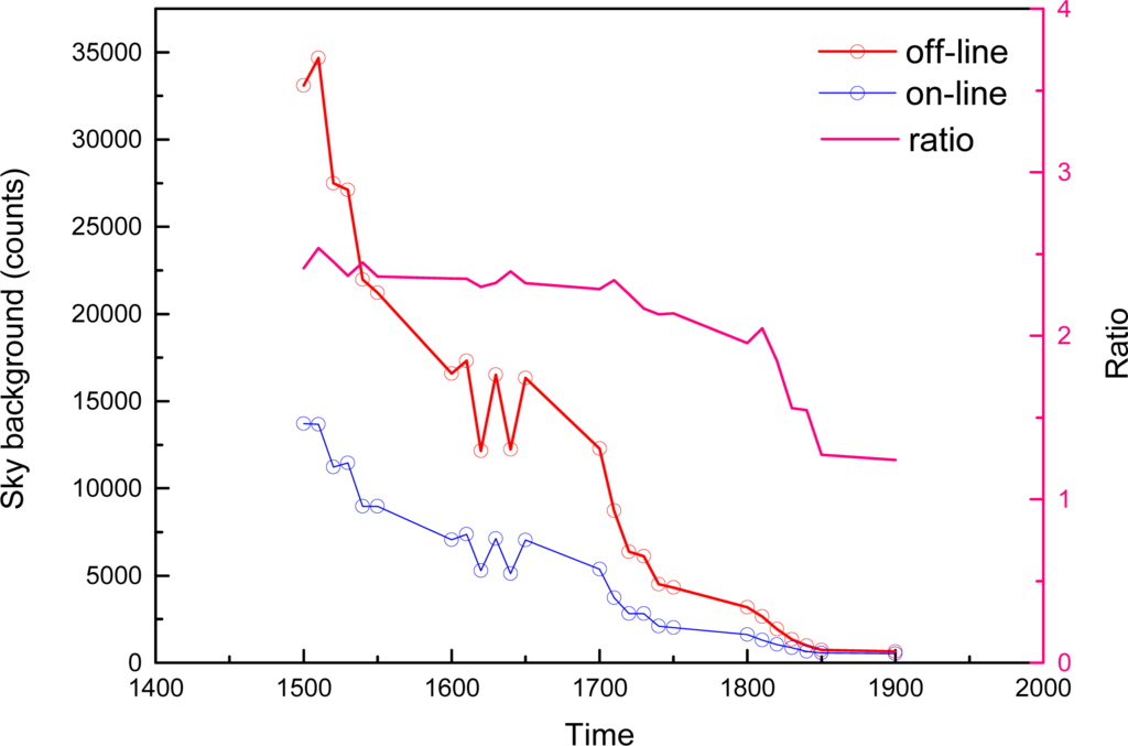 Variation of the on-line and off-line wavelength from the sky background from 07:00 to 11:00 UTC (15:00–19:00 LST)