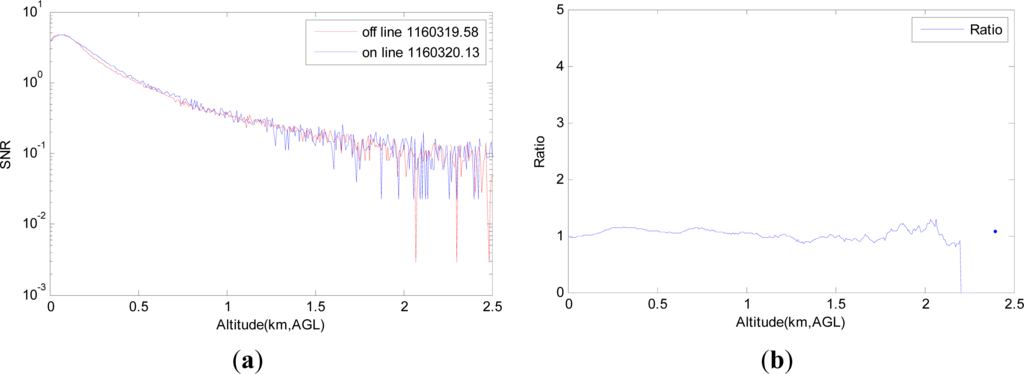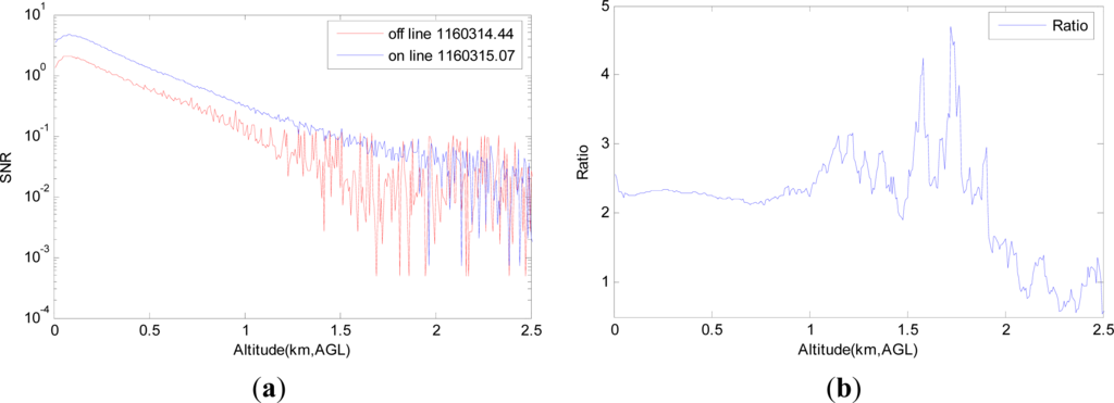 where Ns is laser backscattering signal, Nb is the noise introduced by photons of the sky background, and Ne is the noise from the dark current and readout electronics. Nb and Ne are estimated by the square of the standard deviation of the lidar return signal from the far distance where the background noise and electronics noise dominate. Figure 7a shows the SNR of the returned signal on-line and off-line measurements at 07:00 UTC (15:00 LST). The ratio of on-line SNR to off-line SNR is calculated according to Equation (2). The SNR on-line is obviously higher than the SNR off-line as shown in Figure 7b.