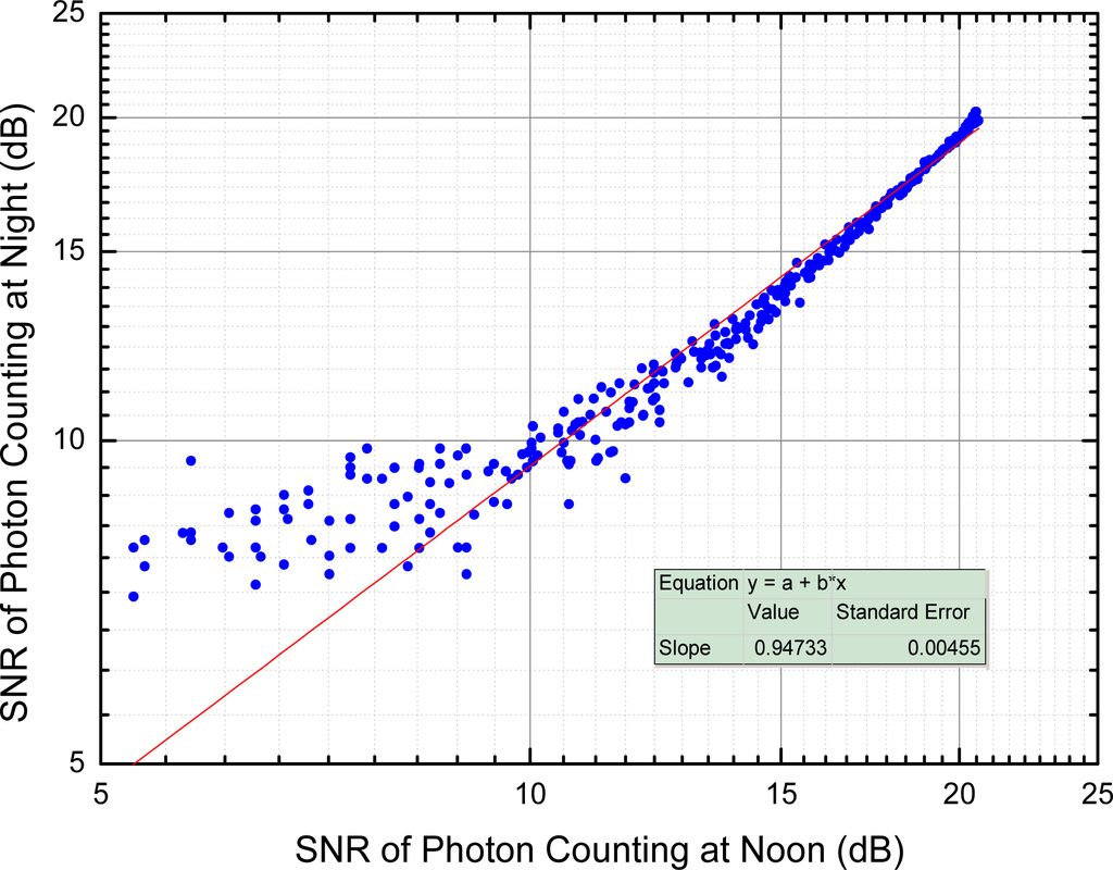 The above lidar return signals were taken at clear and stable weather. In order to eliminate the pulse energy jitter and long term power drift of the transmitting laser, which is prominent for the OPO laser we used, an extra photomultiplier was adopted as reference to eliminate the variation of the laser power. The SNR of the lidar backscatter signals on 3 June 2011 at both noon and night are compared in Figure 9. The analysis shows that the SNR of the measurements in the daytime are almost equivalent to that of night measurements for SNR > 10 decibels. The variation of the SNR between daytime and nighttime is less than ±1 decibels. For the far distance lidar return, night measurements have better SNR than the daytime n mnmeasurement due to the lower background noise at night (for SNR < 10 decibels).