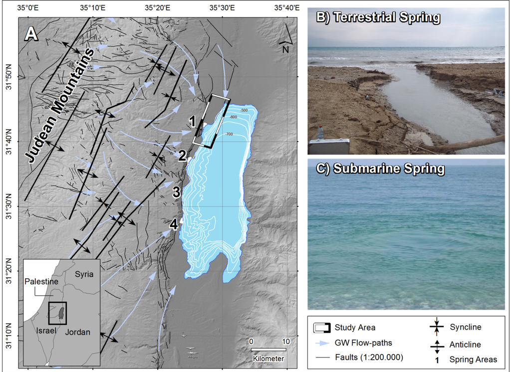 The surrounding area of the Dead Sea (DS) is heavily reliant on groundwater as major water resource for domestic and agricultural water supply [1]. Some authors even state that current groundwater abstraction exceeds available resources which would imply overexploitation [1,2], thus requiring sustainable groundwater management to establish and secure water availability for future generations. In this context, knowledge of uncontrolled groundwater loss is essential for future water management strategies [3]. However, existing groundwater discharge estimates for the western DS coast are discrepant varying between 30 and 96 × 106 m3·a−1 [4–6].