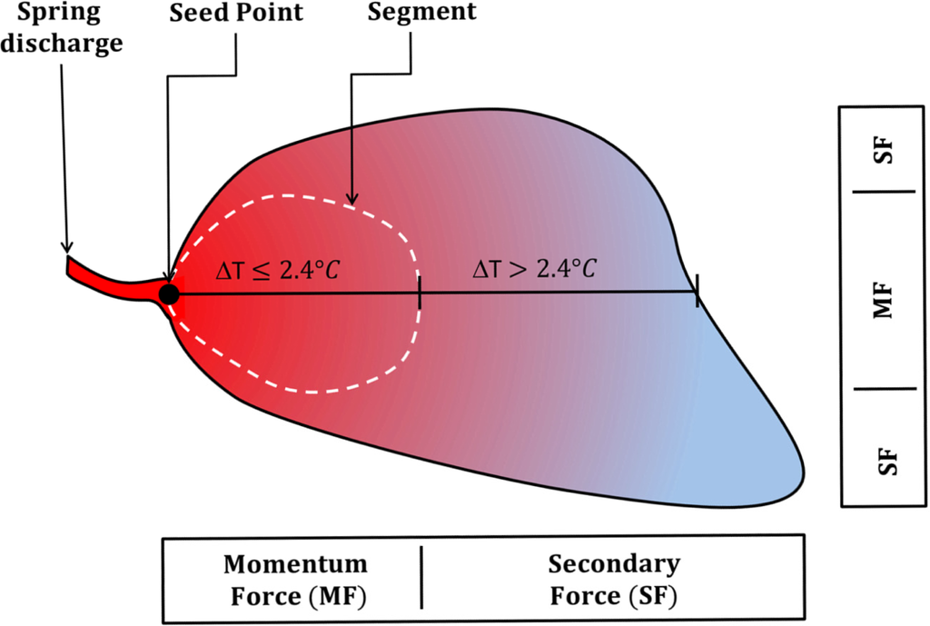 Following this assumption we apply a region growing approach [26] to extract comparable areas with small temperature changes. This approach groups all pixels into segments that fall within a given threshold emanating from a seed point (Figure 2). Since it is of interest to extract the thermal plume area off a discharging spring we defined the outlet as seed point. From the reference temperature at this seed point we applied a user defined threshold of 2.4 °C. This threshold (i) orientates on local conditions (total temperature contrast, secondary forces, etc.); (ii) considers aforementioned findings of Danielescu et al. [14]; (iii) reflects momentum force governed areas only and (iv) was rounded to 2.4 °C in order to account for the camera temperature resolution of 0.08 °C (results in factor 30 and the threshold of 2.4 °C), i.e., all pixel that maximal differ by this threshold value are segmented (grouped). The threshold value was repeatedly used at 16 spring discharge outlets from which the discharge volume was known from IHS measurements. In cases where several springs emerge in a close-by environment and merge into one thermal discharge plume, we subsequently related the thermal plume area to the accumulated discharge volume. The described procedure assures a comparability between different thermal plume areas accounting for the fact that spring water varies in temperature between ∼25–29 °C.