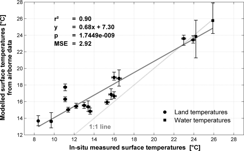 Comparison between in situ measured surface temperatures and modeled surface temperatures obtained from the airborne thermal data set for the study site (note that y-error bars indicate variance of modeled surface temperatures within a 7 × 7 matrix accounting for geometric data inaccuracies and x-error bars indicate instrument inaccuracies).