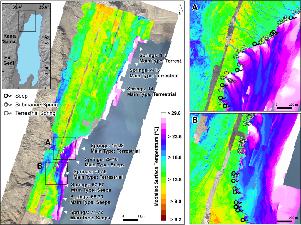 In general, the thermal imaging technique is thoroughly capable to qualitatively monitor spring abundance independent of spring types. The aspect of the suggested third unreported spring type (seeps) might stimulate further hydrogeological investigation on, e.g., their water chemistry and the resulting affiliation to Cretaceous aquifer water, residue from the retreating Dead Sea (or a mixture of both?), traveling mechanisms and pathways through the dense lacustrine sediment or the quantification. Especially the quantification and the respective source would shed some more light on the groundwater discharge picture that actually exists at the Dead Sea and potentially allows developing management plans for future water demands.
