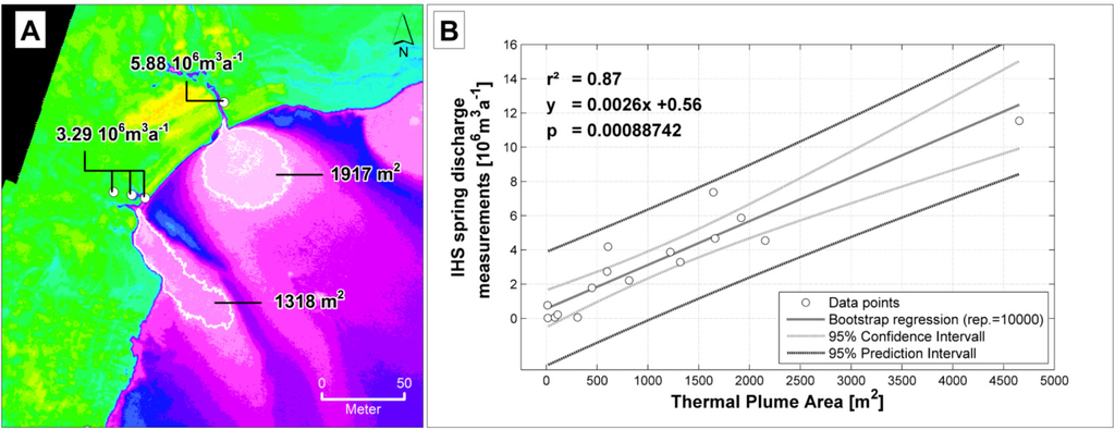 In this context, the presented discharge quantification attempt provides an interesting option for a quantitative monitoring for terrestrial springs with discharge volumes >0.1 × 106 m3·a−1. To date it is not robust enough to rely on the prediction quality. Particularly addressing the outlined potential limitations and the consideration of integrating a limno-physical model into the identified discharge volume/thermal plume area relationship might result in a robust and trustable approach to quantify discharge volume based on airborne thermal data.