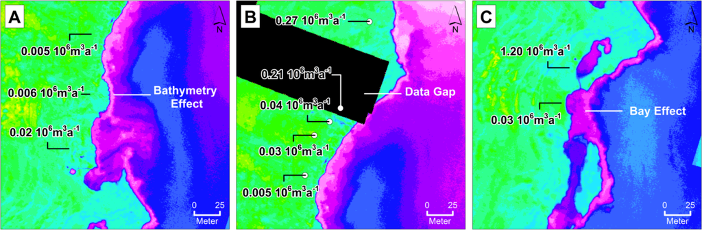 The missed discharge volume from the third factor amounts to 1.2 ×106 m3·a−1 caused by a spring that in contrast to all remaining springs discharges coast-parallel into a bay (Figure 9C). In return, the bay hinders the formation of the thermal plume that subsequently is non-inferable in terms of a thermal segmentation. Since it occurs only once at the investigated area it represents an acknowledgeable but negligible amount similar to the ones before.