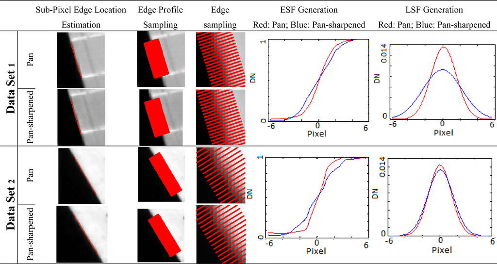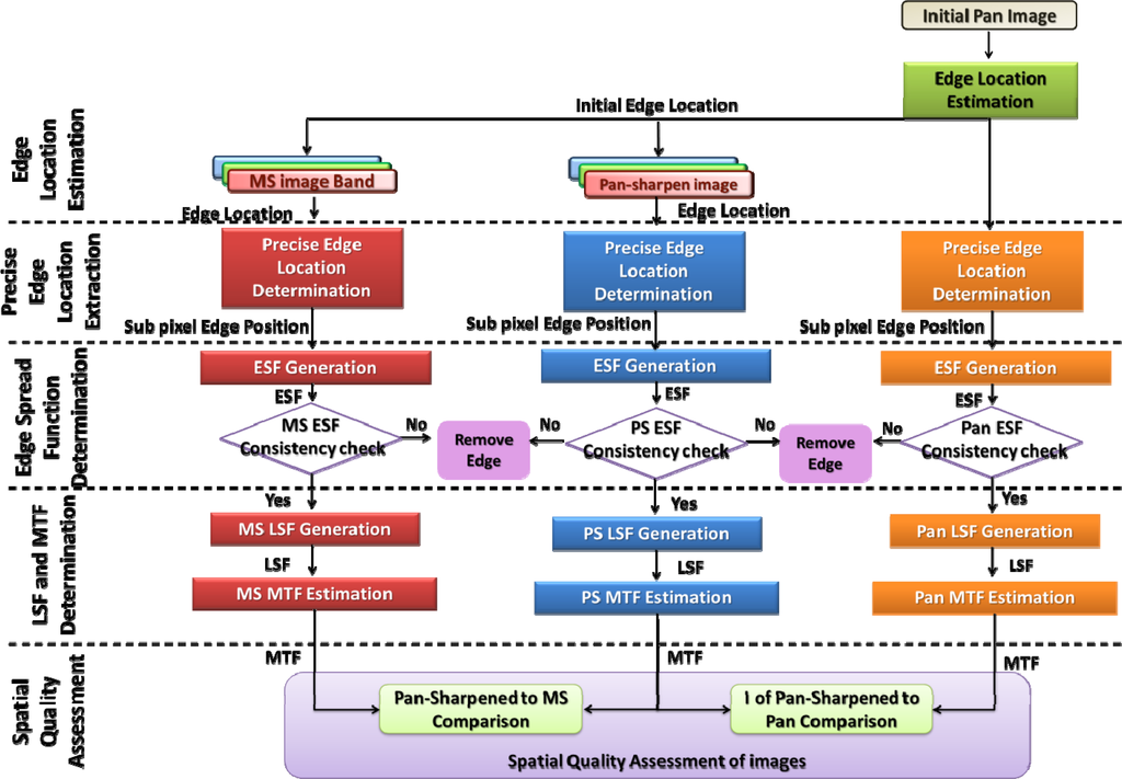 The diagram of the proposed edge-based pan-sharpening spatial quality assessment method is presented in Figure 1. The proposed strategy can be divided into five main steps: edge location estimation, precise edge location extraction, edge spread function determination, LSF, and MTF estimation and spatial quality assessment.