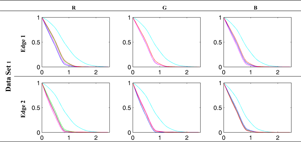 where ERx and ERy refer to the edge response in x and y direction respectively. RER values for all extracted edges are computed and averaged in different image bands of both data sets and results are presented in Figure 13. In this figure, results, which belong to the intensity band of the pan-sharpened image, are dramatically higher because in the second scenario of image evaluation they are compared in the resolution of pan-image and are therefore free from effects of down sampling.