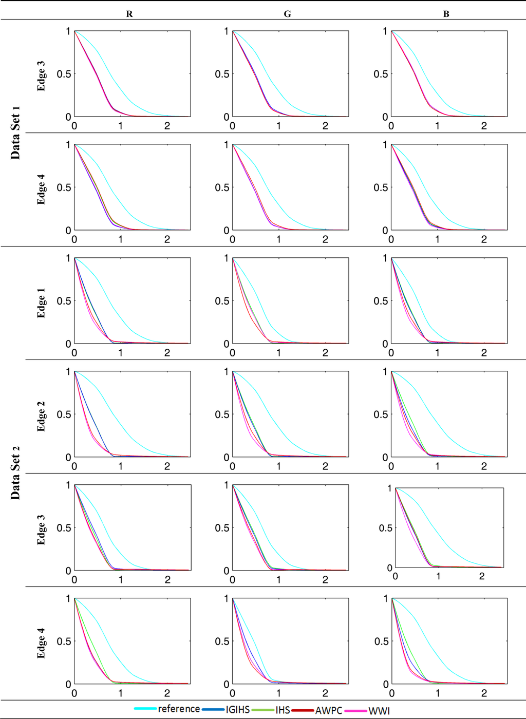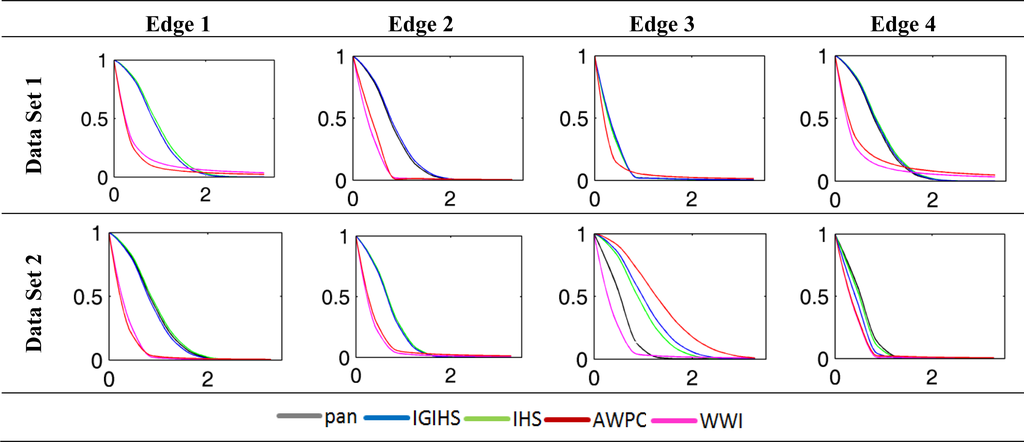 The results depicted in Figure 13 generally show that IHS based methods have better spatial quality in comparison with wavelet based methods in both data sets. This is totally in accordance with those extracted by evaluation of MTF curves based on the proposed strategy and are verified by results of visual comparison of pan-sharpened images.