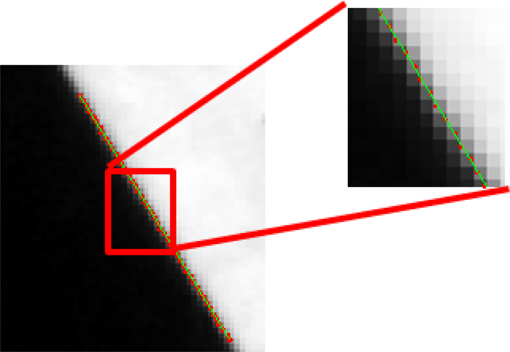 After estimation of sub-pixel edge location, least square line fitting to the achieved locations determines the best approximating line. This line minimizes the differences between the edge points on the approximating line and the given edge points values. Solving least square adjustment for all sample points of the edge, line parameters namely slope (a) and intercept (b), are determined (Equation (11)). Based on the computed line parameters, the final edge location can be determined. Figure 2 demonstrates an example of extracted sub-pixel edge locations and the least square line fitted to them.