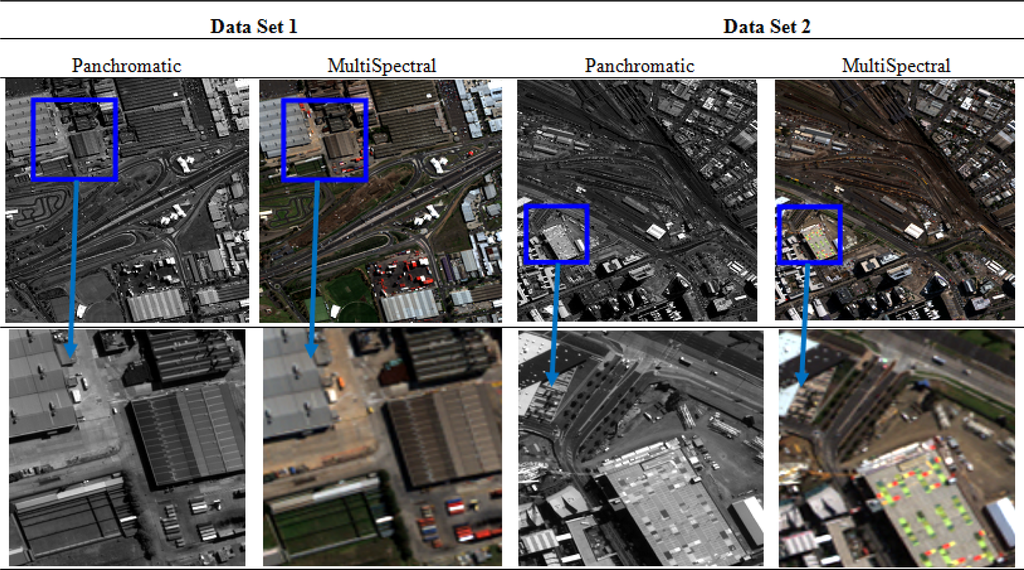 Pan-sharpened images generated by the selected fusion methods for both data sets are presented in Figures 4 and 5. To compare the spatial quality of differently fused images visually, sub-sections (100 × 100 pixels) of the images are extracted and presented.