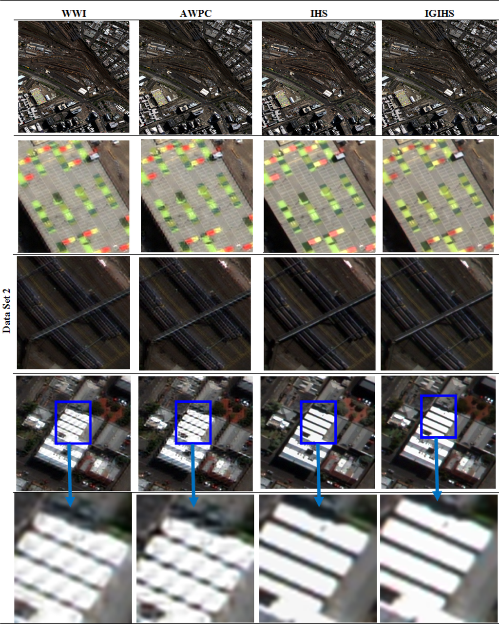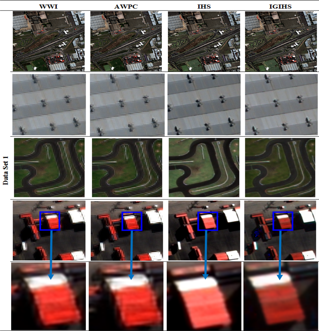 Visual comparison of the results clearly shows the diversity in spatial quality level of images resulting from different techniques. In addition, in case of wavelet based generated images, tangible spatial distortions are obvious, which means IHS based techniques exhibit superior quality considering spatial distortion.