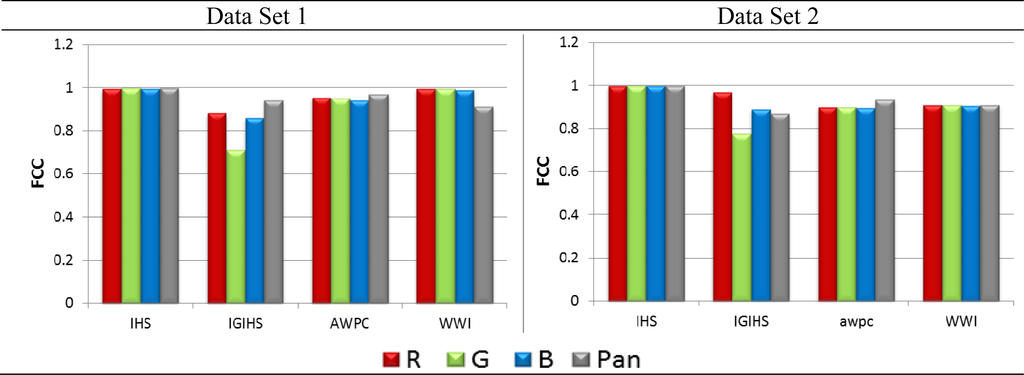 For the possibility of comparing the proposed metric with available methods, the spatial quality of all generated images is evaluated and compared by applying FCC. FCC is one of the most applicable spatial metrics currently proposed [13]. Obtained results are presented in Figure 6, where R, G, and B bands present the results with the first scenario and pan presents results based on the second scenario.