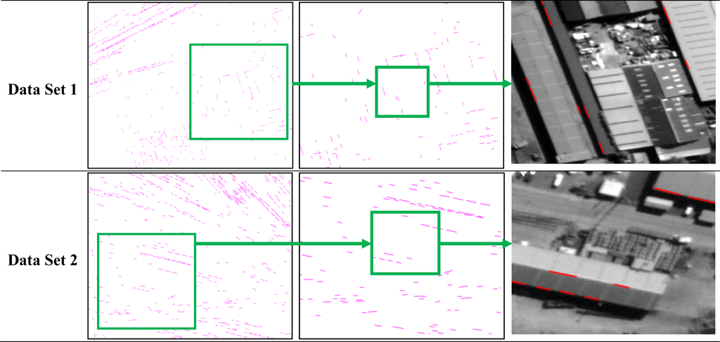 The proposed spatial quality assessment approach is applied on both selected data sets. In the first step, by applying the Canny operator followed by a Hough transform, image edges are extracted for both image data sets. As was discussed previously, to choose appropriate edge candidates, a consistency check is applied on extracted edges and those which appear weak, too short, and too long are removed. Finally, extracted edges are presented in Figure 7. To have a better representation of the results, only parts of images are presented here.
