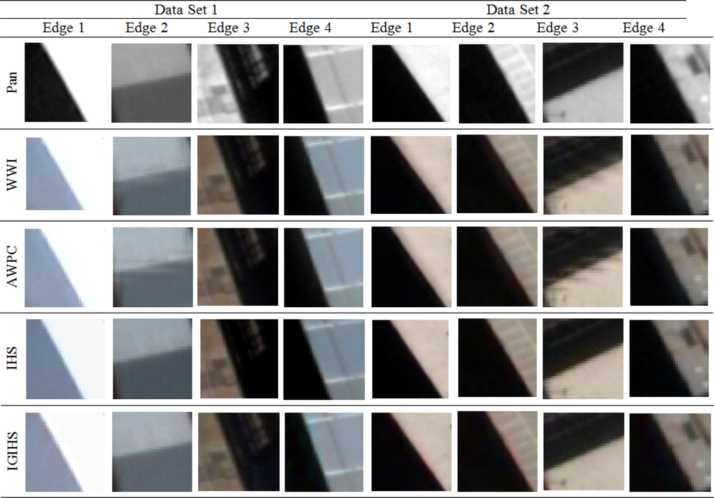 Samples of selected edges in both data sets and for all pan-sharpening methods.