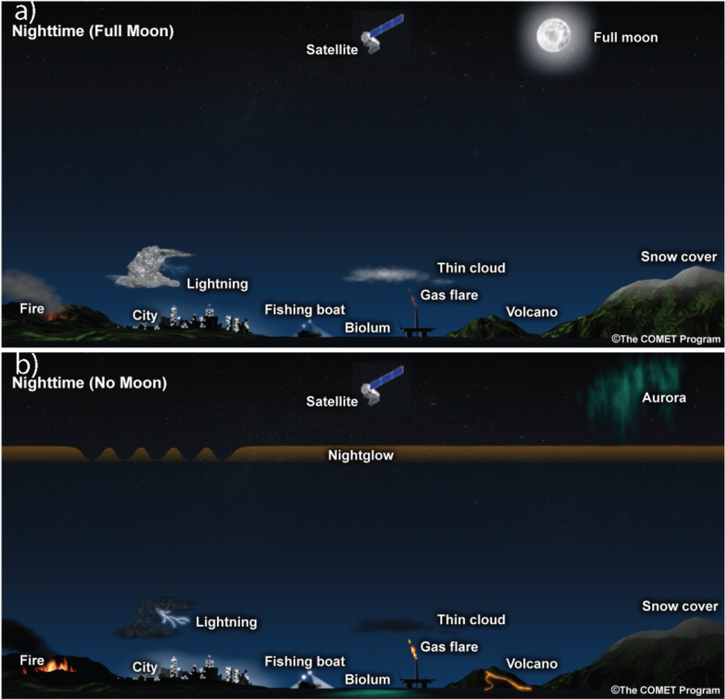 Conceptual diagram of various nocturnal environment parameters observable under conditions of (a) lunar illumination, and (b) on moon-free nights. (Courtesy of Steve Deyo, UCAR COMET Program).