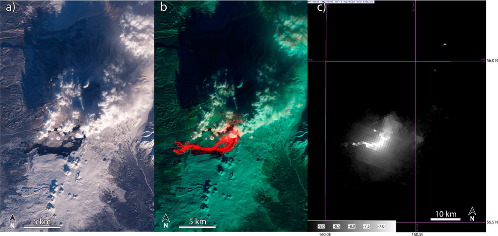 NASA Earth-Observing-1 (EO-1) Advanced Land Imager (ALI) visible (a) and near-infrared (b) high resolution (∼30 m pixels) views of a pyroclastic flow on 1 December 2012, associated with the eruption of the Plosky Tolbachik volcano. VIIRS DNB radiance imagery on a moonless night (12 December 2012, 1547 UTC) matched to approximately the same location (c), shows visible light emission from the same feature. (EO-1 imagery courtesy of J. Allen, NASA Earth Observatory).