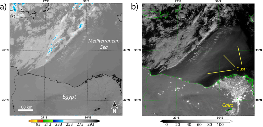 Mineral dust plays an integral role within the climate system. It alters the atmospheric and surface radiation balance via both direct and indirect processes, changes the nature of clouds and precipitation, affects surface hydrology via snow/ice albedo suppression, and provides iron-rich nutrients stimulating phytoplankton growth to both the oceans and rain forests. Dust can represent a hazard to humans in terms of its adverse impacts on air quality (respiratory health) and atmospheric visibility (e.g., aviation and surface-based travel). These impacts are not localized to the desert regions; lofted dust is transported globally [51]. Satellite-based multispectral methods are well suited to the dust detection problem (e.g., [52]) but can experience challenges at night, particularly when the dust is close to the surface.