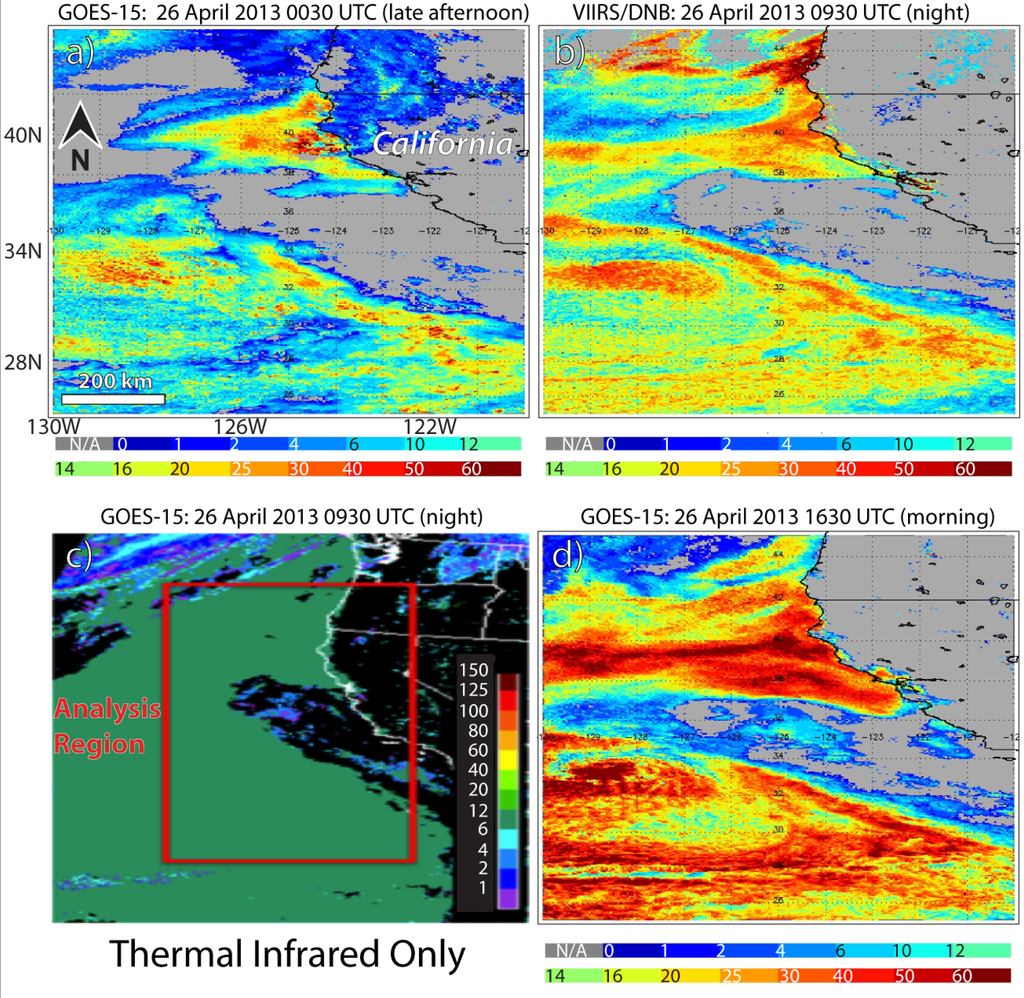 Figure 12 shows a sequence of cloud optical depth retrievals for a field of marine stratocumulus clouds off the California coast. Daytime retrievals from GOES for the late afternoon of 25 April 2013 (Figure 12a; 1630 local time, or 26 April 2013, 0030 UTC) and the following morning (Figure 12d; 0830 local) utilize the Daytime Cloud Optical and Microphysical Properties (DCOMP) algorithm outlined in [60]. The center two panels compare nighttime cloud optical depth retrievals for the same region based on an adaptation of the DCOMP to accommodate DNB lunar reflectance measurements (Figure 12b; [61]) and the experimental Shortwave-infrared Infrared Split-window Technique (SIST) GOES-15 (Figure 12c; [62]). Peak visible optical depths in the late afternoon are in the range of 40–60, and significantly higher in the morning image. The trend is consistent with those noted from field program data such as the First International Satellite Cloud Climatology Project (ISCCP) Regional Experiment I (FIRE I; [63]), with a minimum in the mid-afternoon and maximum just prior to sunrise. The DNB retrievals confirm the trend toward optically thicker clouds at night, whereas the SIST retrieval lacks sensitivity to clouds with visible optical depths larger than ∼10 due to saturation of the infrared signals.