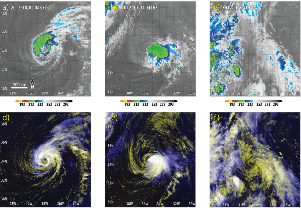 (a–c) VIIRS/M15 thermal infrared imagery (K) sequence from 2 to 4 October 2012 of Hurricane Nadine’s dissipation over the central Atlantic Ocean; showing the evolution from a relatively well-defined eye in (a) to an asymmetric convection pattern in (b) due to increasing wind shear, and ultimately complete dissociation of the upper level circulation in (c). (d–f) Corresponding VIIRS/DNB and M15 false-color composite imagery, with lower-level clouds shown in yellow and upper-level clouds in blue/white, provides superior tracking of the low-level circulation pattern, particularly in the latter stages.