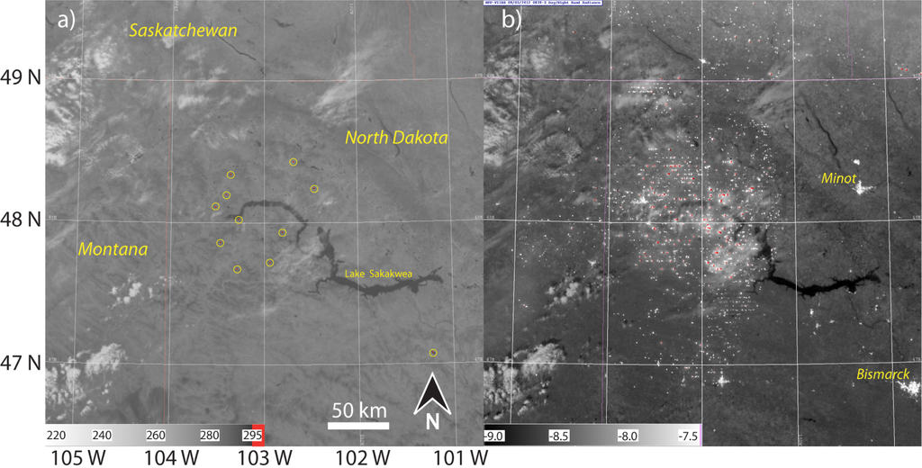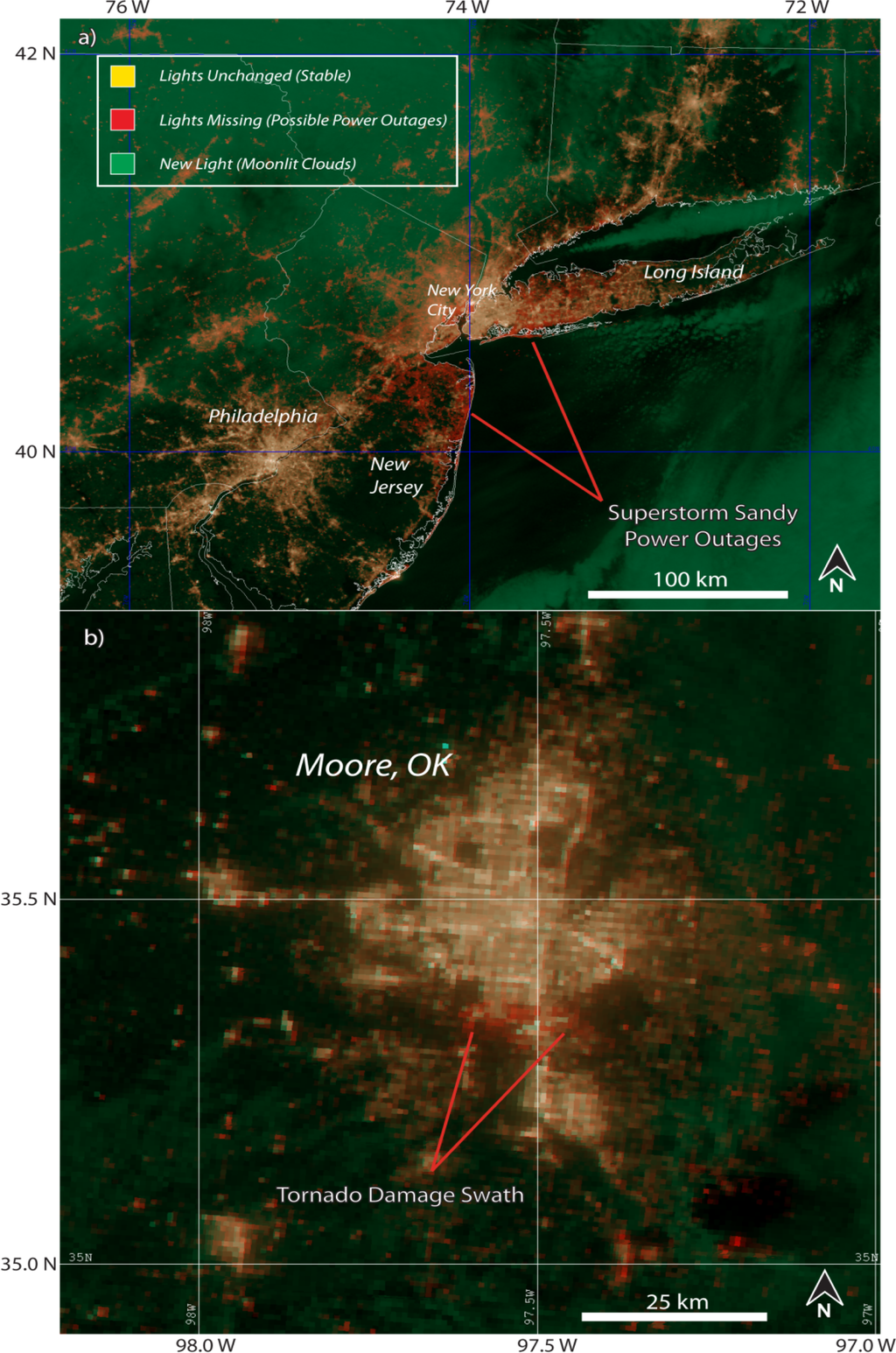 Satellite imagery holds high value for assessing post-disaster impacts (e.g., [76]), and low-light visible sensing can play a particularly important role. Figure 15 depicts two notable recent examples of power outages associated with natural disasters (in the aftermath of Super Storm Sandy in Figure 15a, and the Moore, Oklahoma tornado in Figure 15b)—reminders of the coupling between the atmosphere, hydrosphere, and biosphere—that were captured by comparing before/after imagery from the VIIRS/DNB. The examples are presented in the form of false color composite imagery, where a scene prior to the outage (“baseline”) is compared against a co-registered scene from after the outage. The information is encoded in such a way so as to produce red tonality in regions where bright lights existed in the baseline imagery but are not present in the “after” imagery. These red pixels, when they occur in the absence of cloud cover, are interpreted as power outages. Golden tonality corresponds to unchanged light emissions between the two times, and green tonality corresponds to regions where the “after” scene is brighter than the baseline. These green pixels may correspond to either the presence of moonlight reflecting clouds in the “after” scene, or in some cases to valid new lights corresponding, e.g., to search and rescue operations or triage stations established by emergency managers in wake of a natural disaster.
