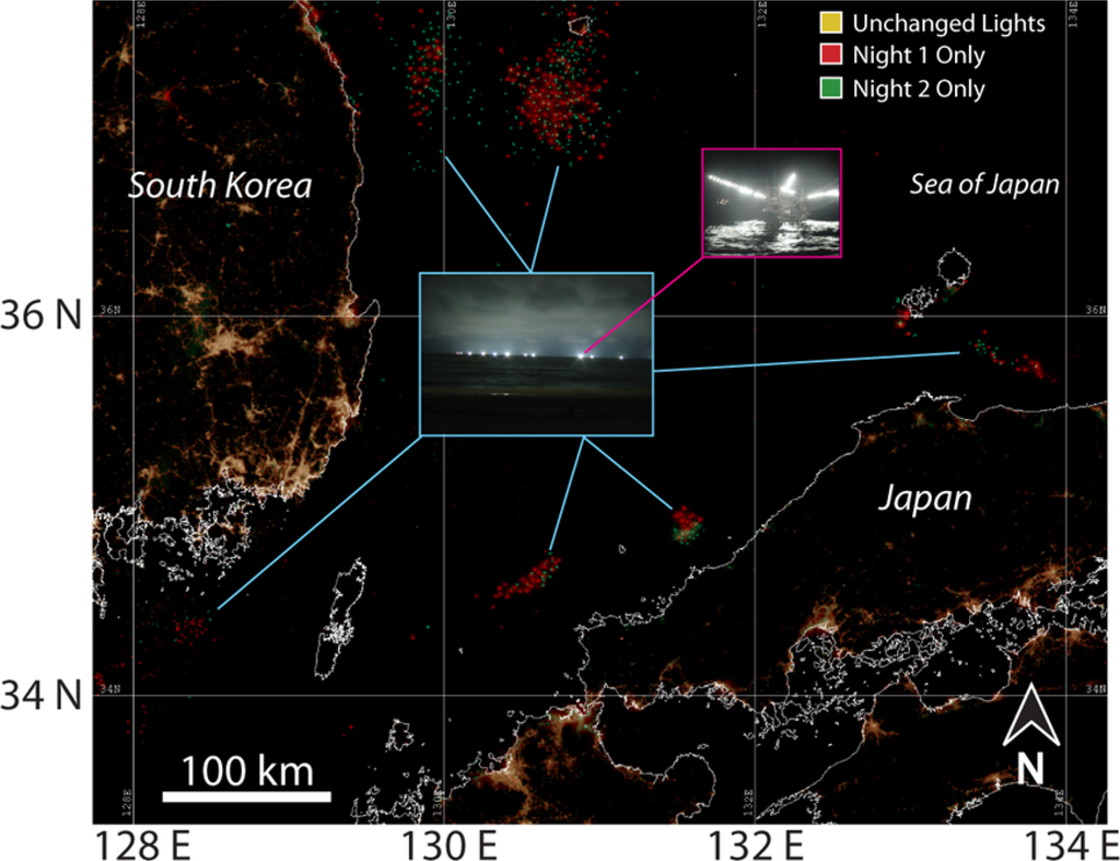 - Waluda, C.M.; Yamashiro, C.; Elvidge, C.D.; Hobson, V.R.; Rodhouse, P.G. Quantifying light-fishing for Dosidicus. gigas in the eastern Pacific using satellite remote sensing. Remote Sens. Environ 2004, 91, 129–133. [Google Scholar]