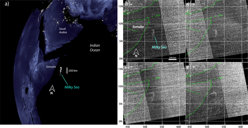 - Herring, P.J.; Watson, M. Milky seas: A bioluminescent puzzle. Mar. Obs 1993, 63, 22–30. [Google Scholar]
