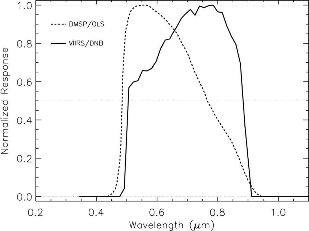 Spectral response functions for the DNB and a representative nighttime OLS.