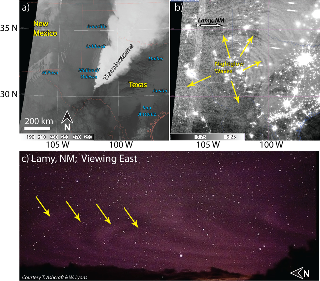 Lightning produced by electrified storm clouds is perhaps one of the most recognizable sources of atmospheric light emission. The direct human hazards associated with cloud-to-ground lightning are well understood, and the more common inter/intra-cloud flashes [64] can damage electronic equipment on aviation and space launch craft [65]. Indirectly, the presence of lightning is an indicator of intense convection and the associated aviation hazards of in-cloud and clear-air turbulence, strong speed and directional wind shear (including microbursts), large hail and super-cooled liquid water droplets, and reduced visibility. In terms of forecasting, changes in lightning density and flash rate have proven useful for issuing severe thunderstorm and tornado warnings [66], and the presence of lightning has been used as a basis for modifying environmental state properties of numerical weather prediction models leading to more accurate simulations (e.g., [67,68]).